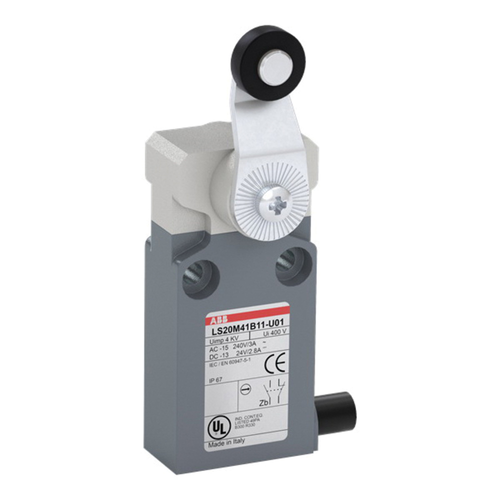 ABB LS20M41B11-U01 LS Series Miniature Prewired Limit Switch, 24/120/240 VAC, 24/125/240 VDC, 0.1/0.22/1.1/1.5/3/5 A, Roller Lever Actuator, 1NC-1NO Contact