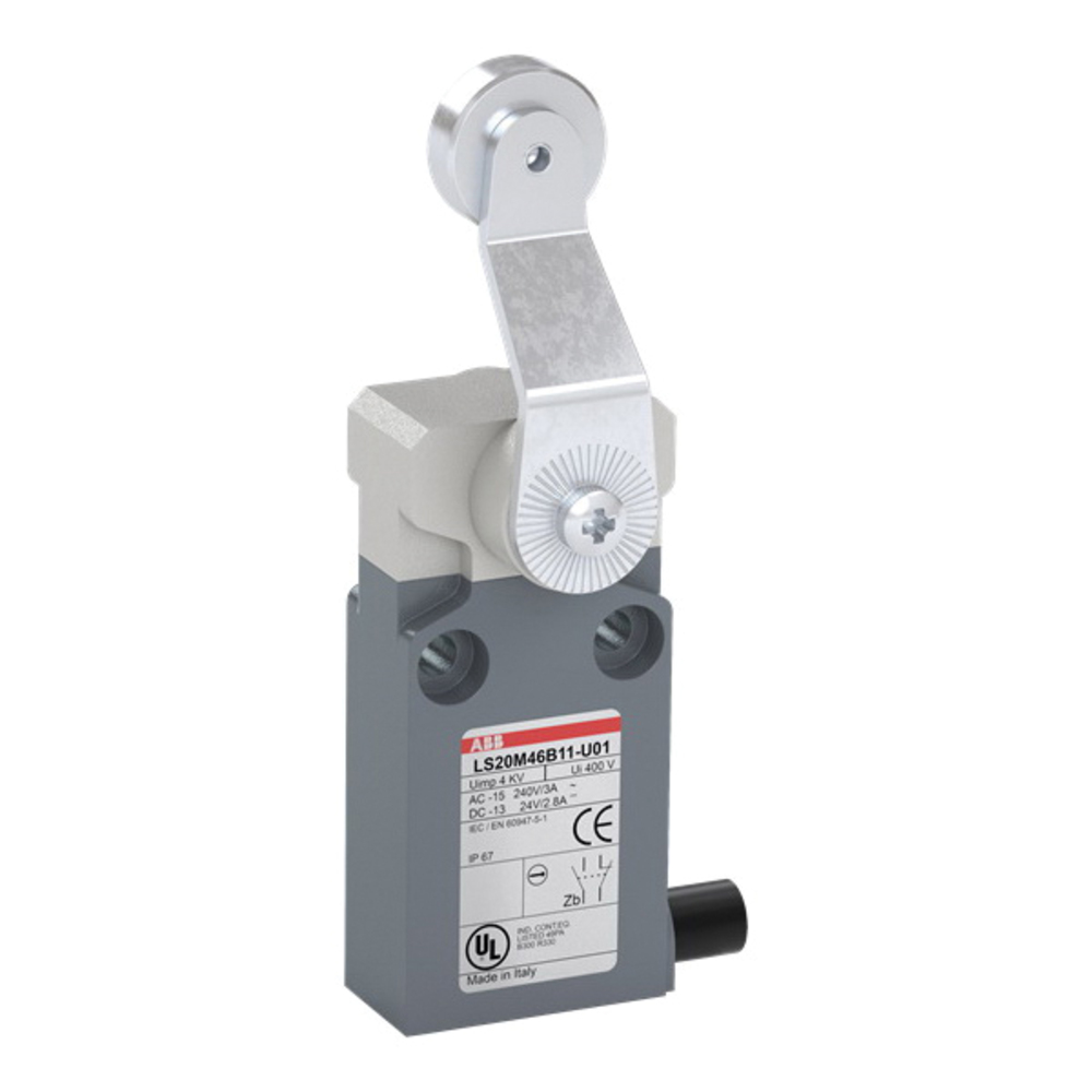 ABB LS20M46B11-U01 LS Series Miniature Prewired Limit Switch, 24/120/240 VAC, 24/125/240 VDC, 0.1/0.22/1.1/1.5/3/5 A, Roller Lever Actuator, 1NC-1NO Contact