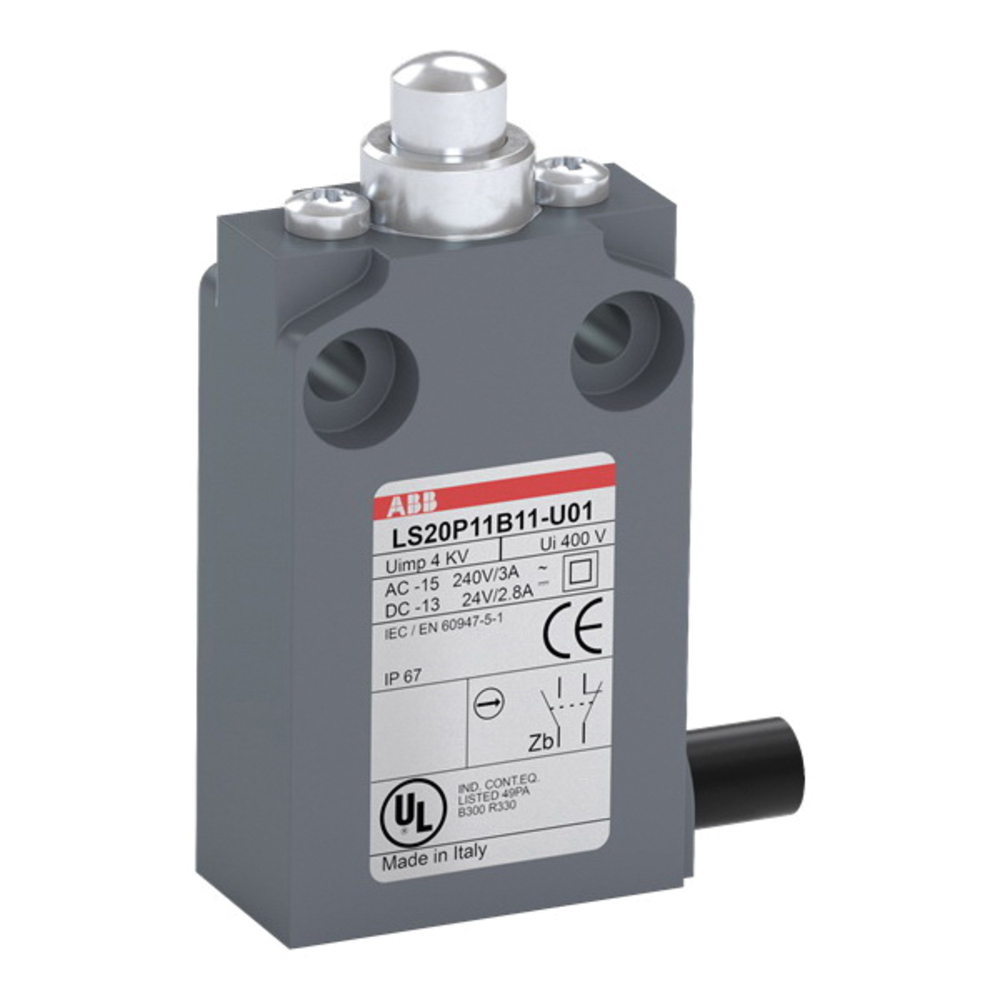 ABB LS20P11B11-U01 LS Series Miniature Prewired Limit Switch, 24/120/240 VAC, 24/125/240 VDC, 0.1/0.22/1.1/1.5/3/5 A, Metal Plain Plunger Actuator, 1NC-1NO Contact