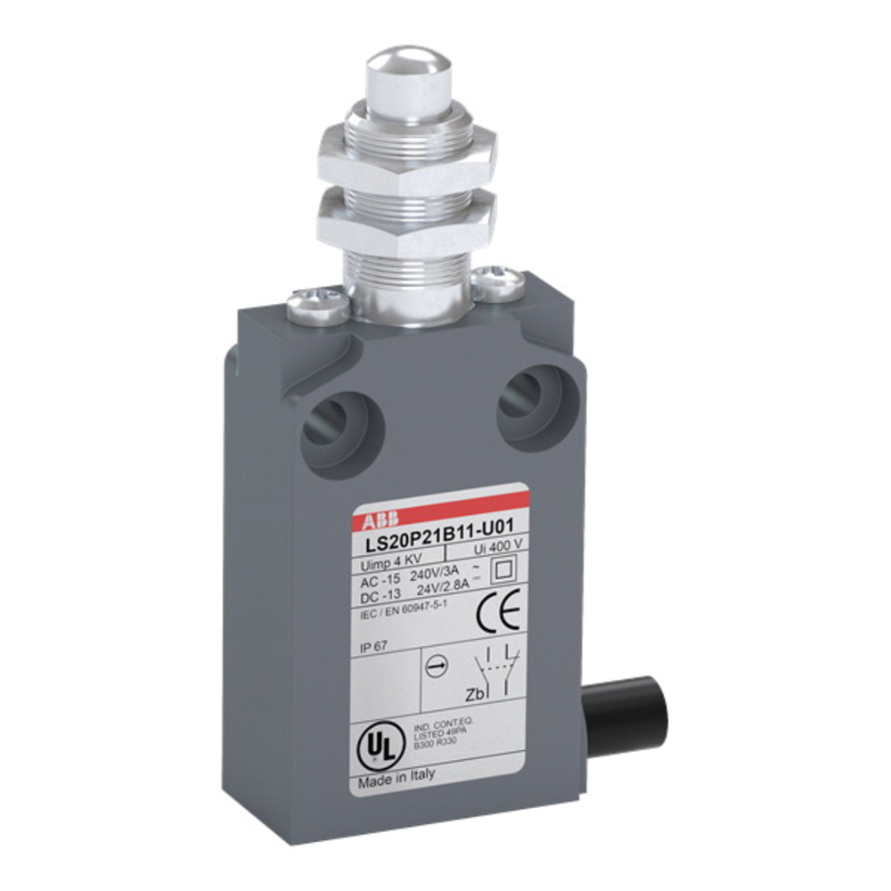 ABB LS20P21B11-U01 LS Series Miniature Prewired Limit Switch, 24/120/240 VAC, 24/125/240 VDC, 0.1/0.22/1.1/1.5/3/5 A, Plunger Actuator, 1NC-1NO Contact