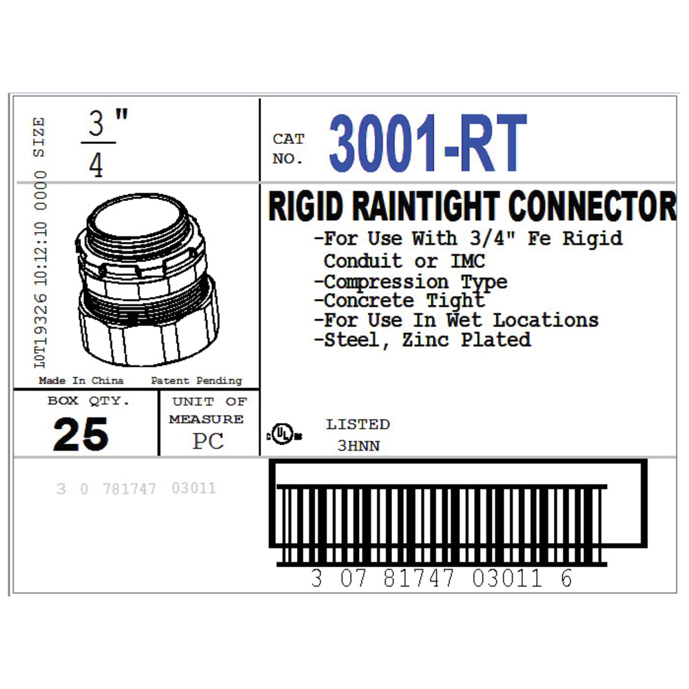Bridgeport® 3001-RT 3000 Raintight Rigid Threadless Compression Connector, 3/4 in Trade, Steel, Zinc Plated