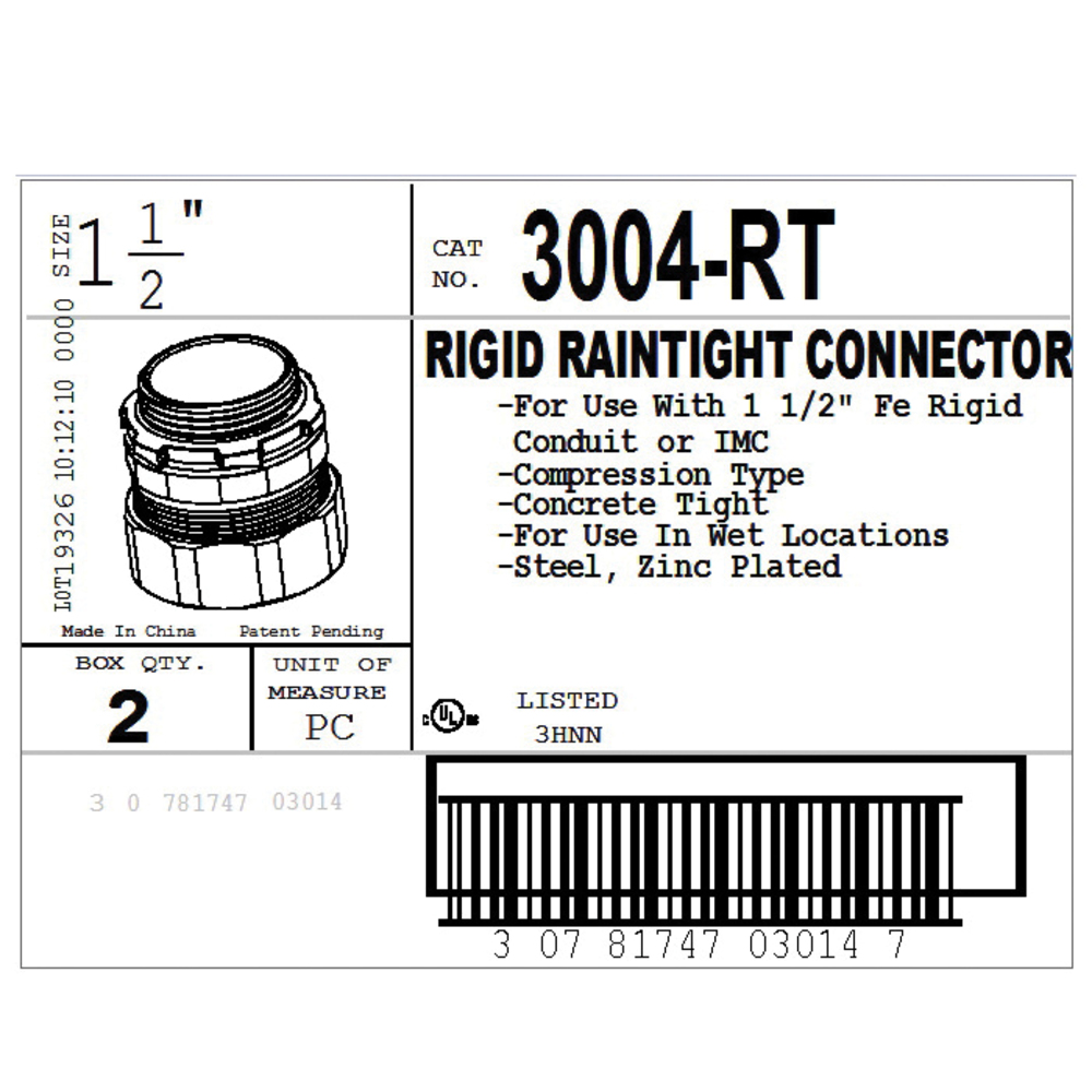 Bridgeport® 3004-RT 3000 Raintight Rigid Threadless Compression Connector, 1-1/2 in Trade, Steel, Zinc Plated