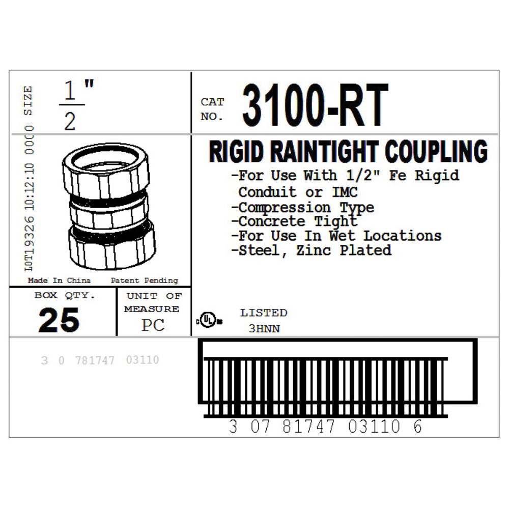 Bridgeport® 3100-RT Raintight Rigid Threadless Compression Coupling, 1/2 in, For Use With: IMC/Rigid Conduit, Steel, Zinc Plated