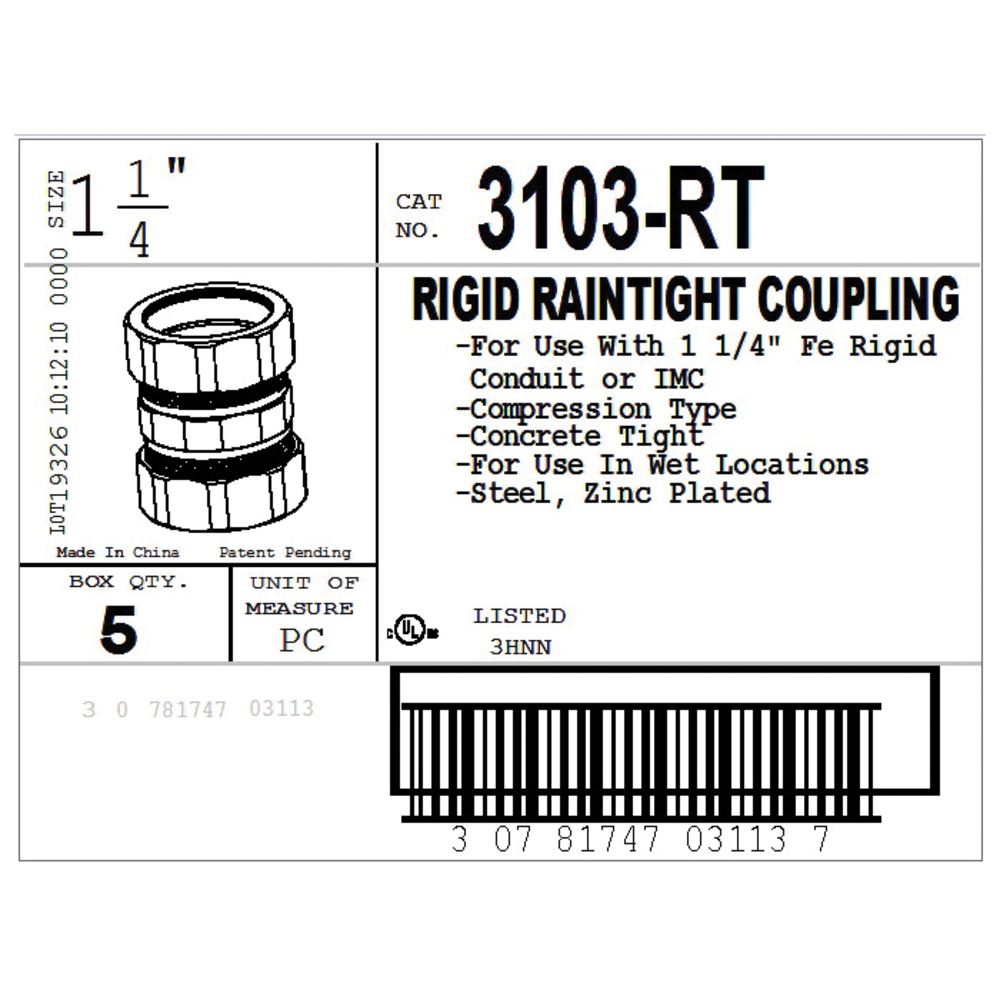 Bridgeport® 3103-RT 3100 Raintight Rigid Threadless Compression Coupling, 1-1/4 in, For Use With: IMC/Rigid Conduit, Steel, Zinc Plated
