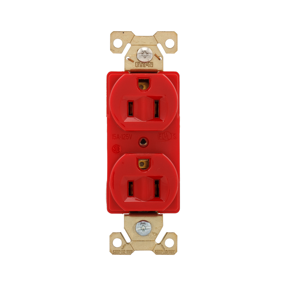 EATON Arrow Hart® AH5252RD Auto Grounding Duplex/Single Standard Straight Blade Receptacle, 125 VAC, 15 A, 2 Poles, 2 Wires, Red
