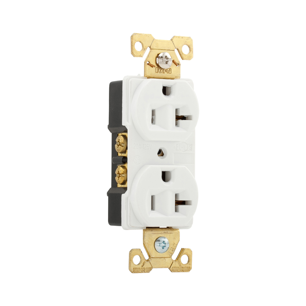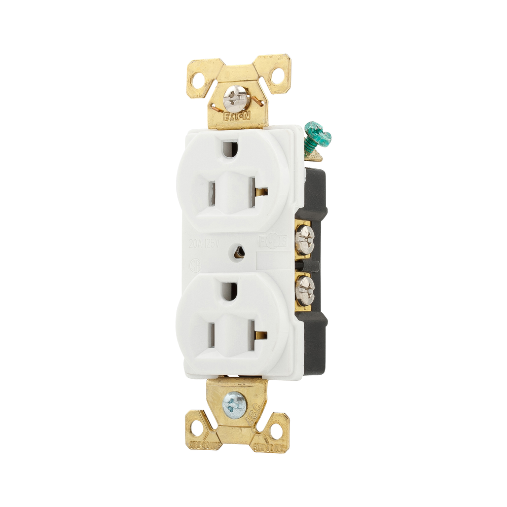 EATON Arrow Hart® AH5352W Auto Grounding Duplex/Single Standard Straight Blade Receptacle, 125 VAC, 20 A, 2 Poles, 3 Wires, White
