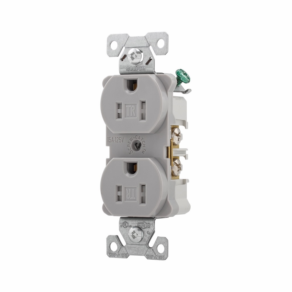 EATON Arrow Hart® AHTR5262GY AHTR5262 Duplex Extra Heavy Duty Grounding Tamper-Resistant Straight Blade Receptacle With Terminal Guard, 125 VAC, 15 A, 2 Poles, 3 Wires, Gray