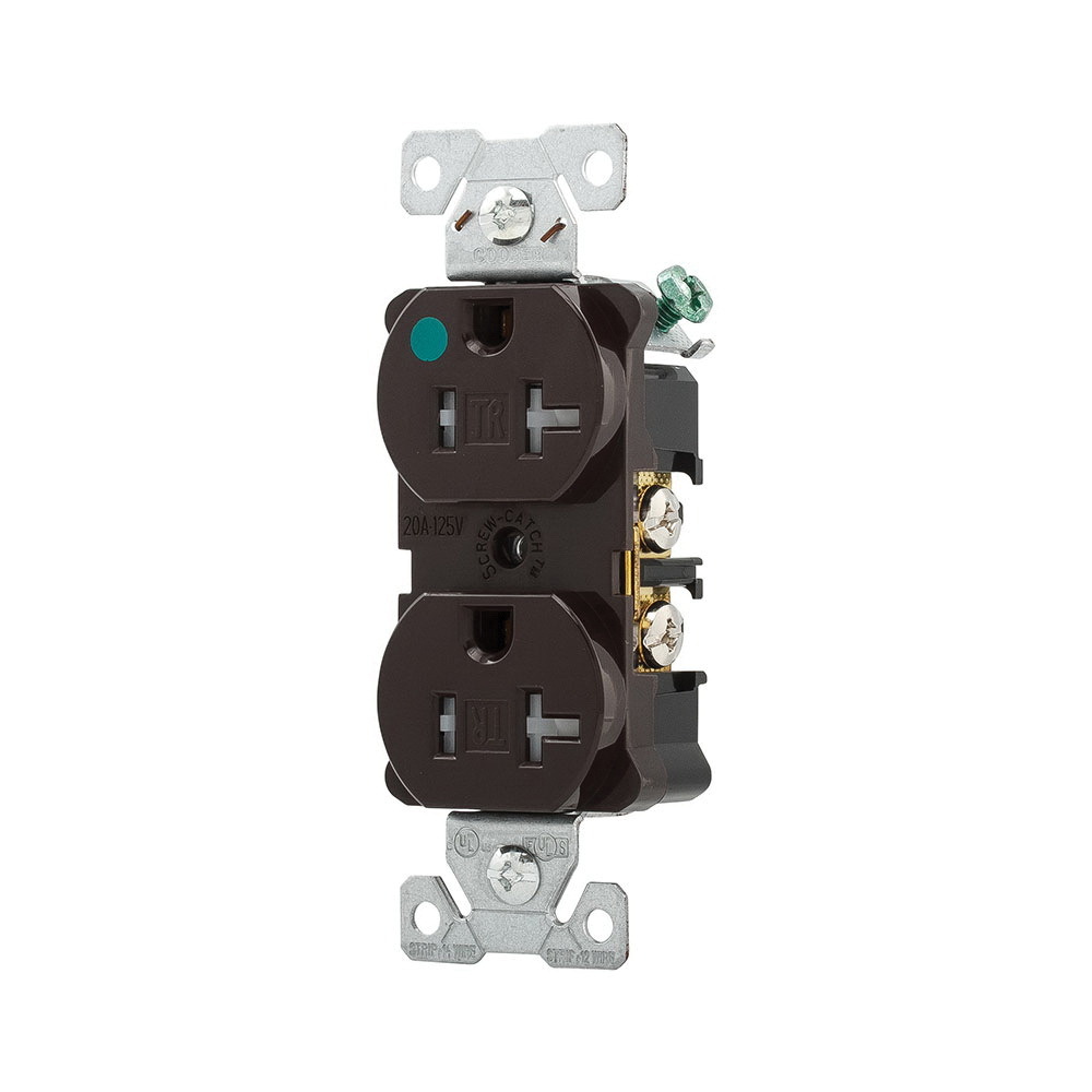 EATON Arrow Hart® AHTR8300B AHTR8300 Duplex Heavy Duty Grounding Tamper-Resistant Straight Blade Receptacle With Terminal Guard, 125 VAC, 20 A, 2 Poles, 3 Wires, Brown