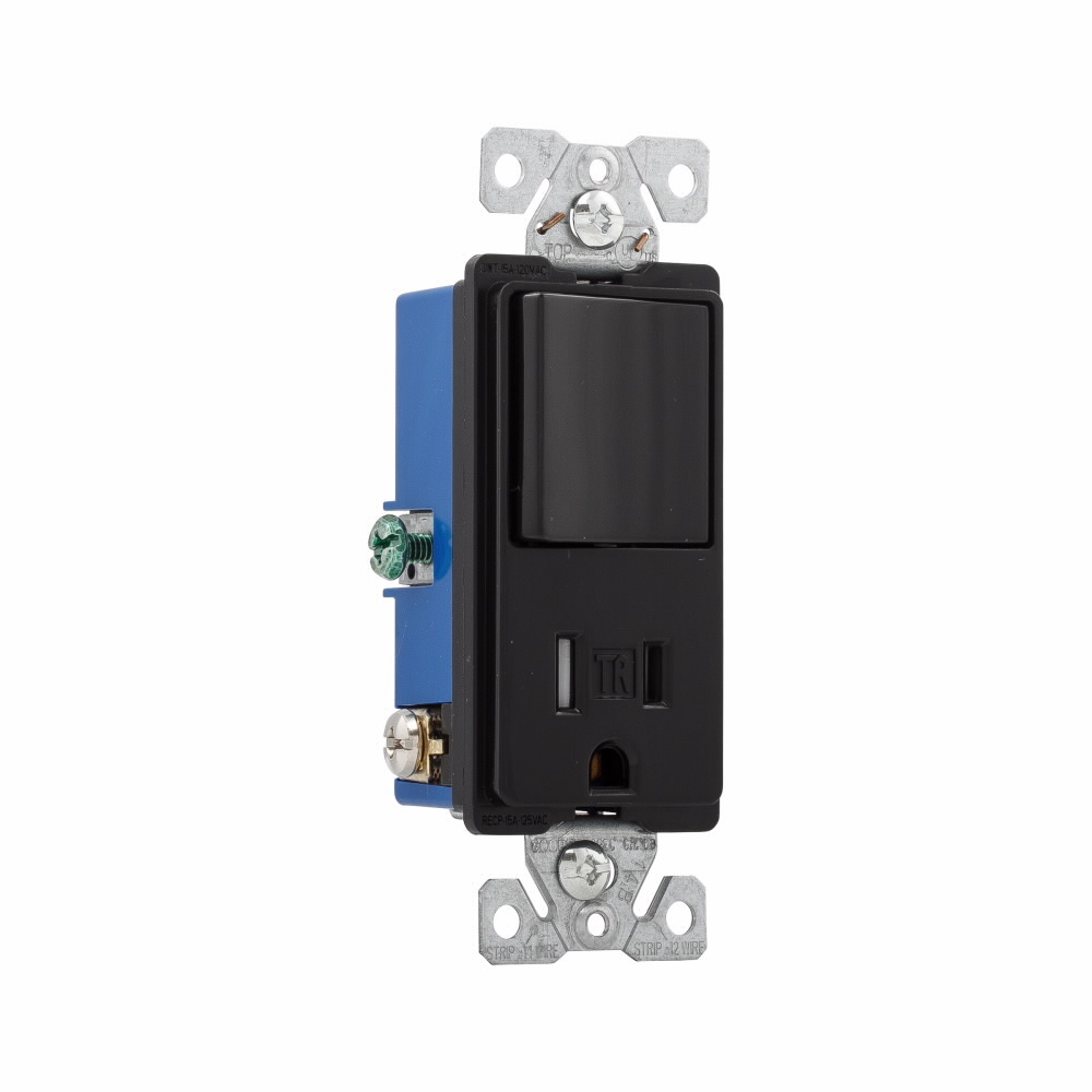 EATON TR7730BK Decorator Straight Blade Tamper Resistant Combination Receptacle and Switch, 120/277 VAC, 15 A, 1 Poles, 3 Wires, 16 to 12 AWG Wire