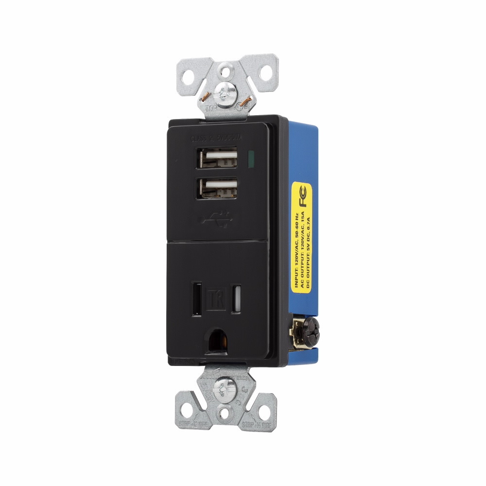 EATON Eaton Wiring Devices TR7740BK-BOX Combination Grounding USB Charger With Tamper-Resistant Single/Duplex Decorator Receptacle, 15 A at 125 VAC, 2 Poles, 3 Wires, Black