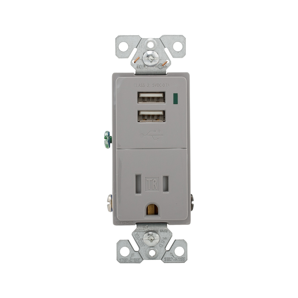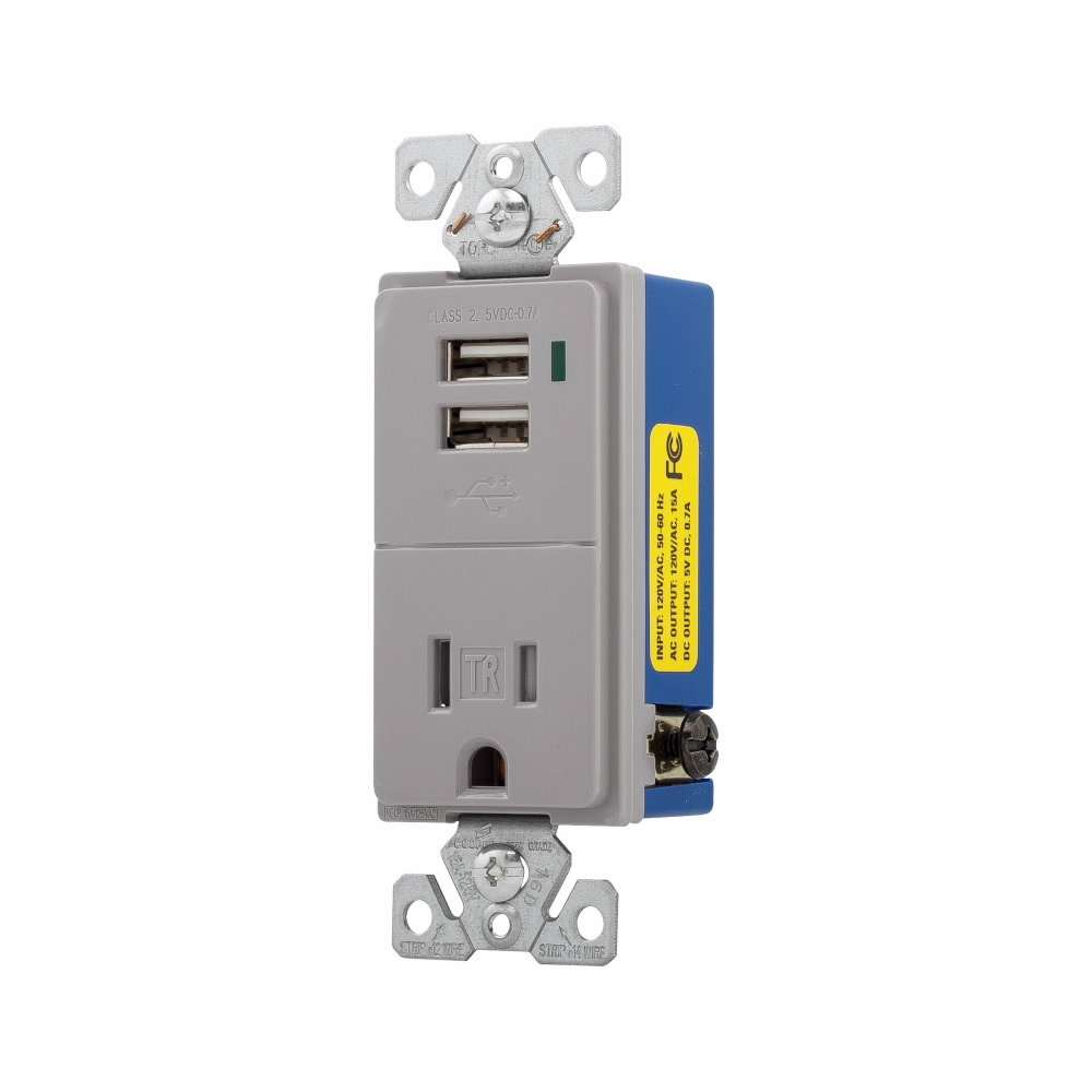 EATON Arrow Hart® TR7740GY-BOX Tamper Resistant Combo USB Charger and Duplex Receptacle, 2 Poles, 3 Wires, Gray