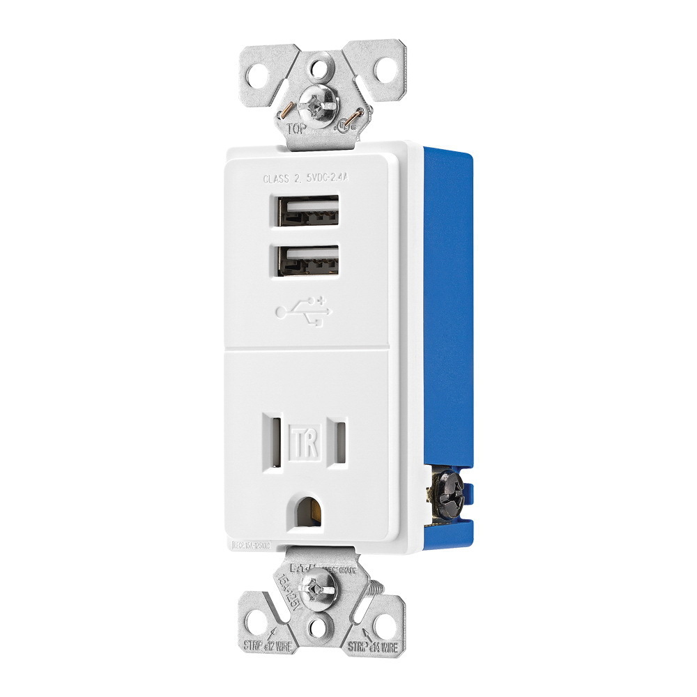EATON TR7741W-BOX Combination Grounding USB Charger With Tamper-Resistant Single Decorator Receptacle, 15 A at 125 VAC, 2 Poles, 3 Wires, White