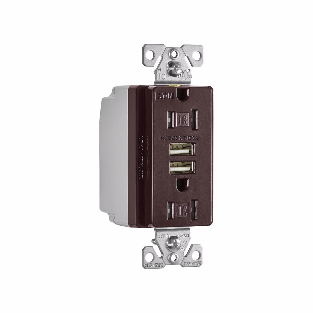 EATON Arrow Hart™ TR7755B-BOX Combination Grounding USB Charger With Tamper-Resistant Duplex Decorator Receptacle, 15 A at 125 VAC, 2 Poles, 3 Wires, Brown