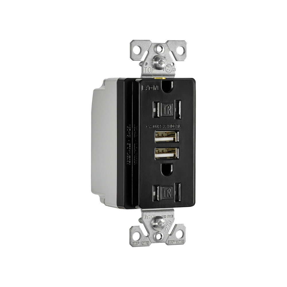 EATON TR7755BK-BOX Combination Grounding USB Charger With Tamper-Resistant Duplex Decorator Receptacle, 15 A at 125 VAC, 2 Poles, 3 Wires, Black