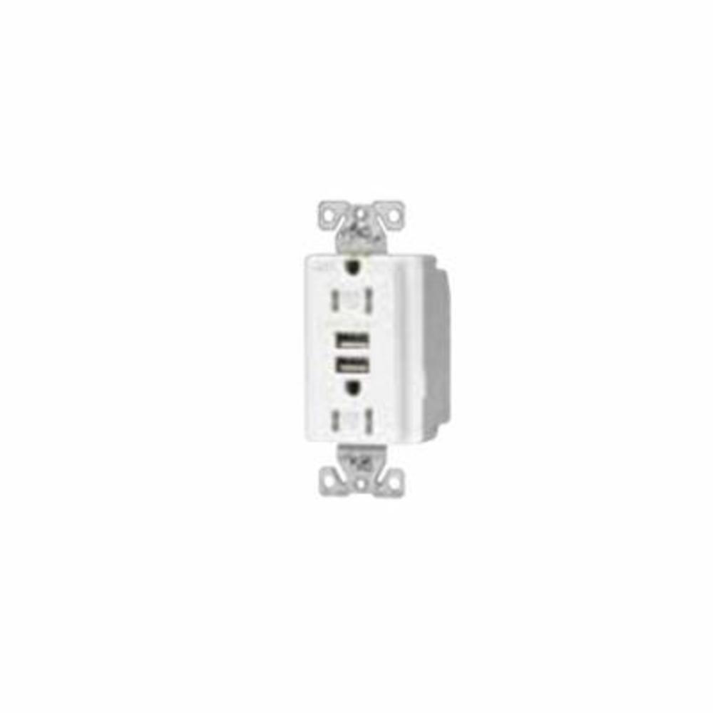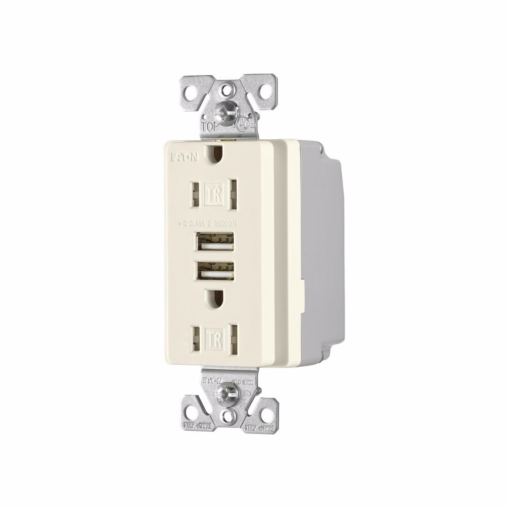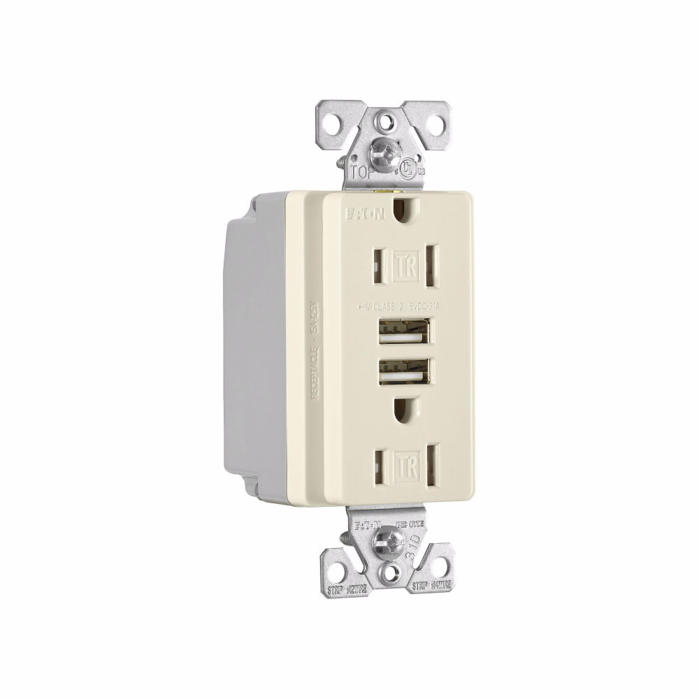 EATON Arrow Hart™ TR7755LA-BOX Combination Grounding USB Charger With Tamper-Resistant Duplex Decorator Receptacle, 15 A at 125 VAC, 2 Poles, 3 Wires, Light Almond