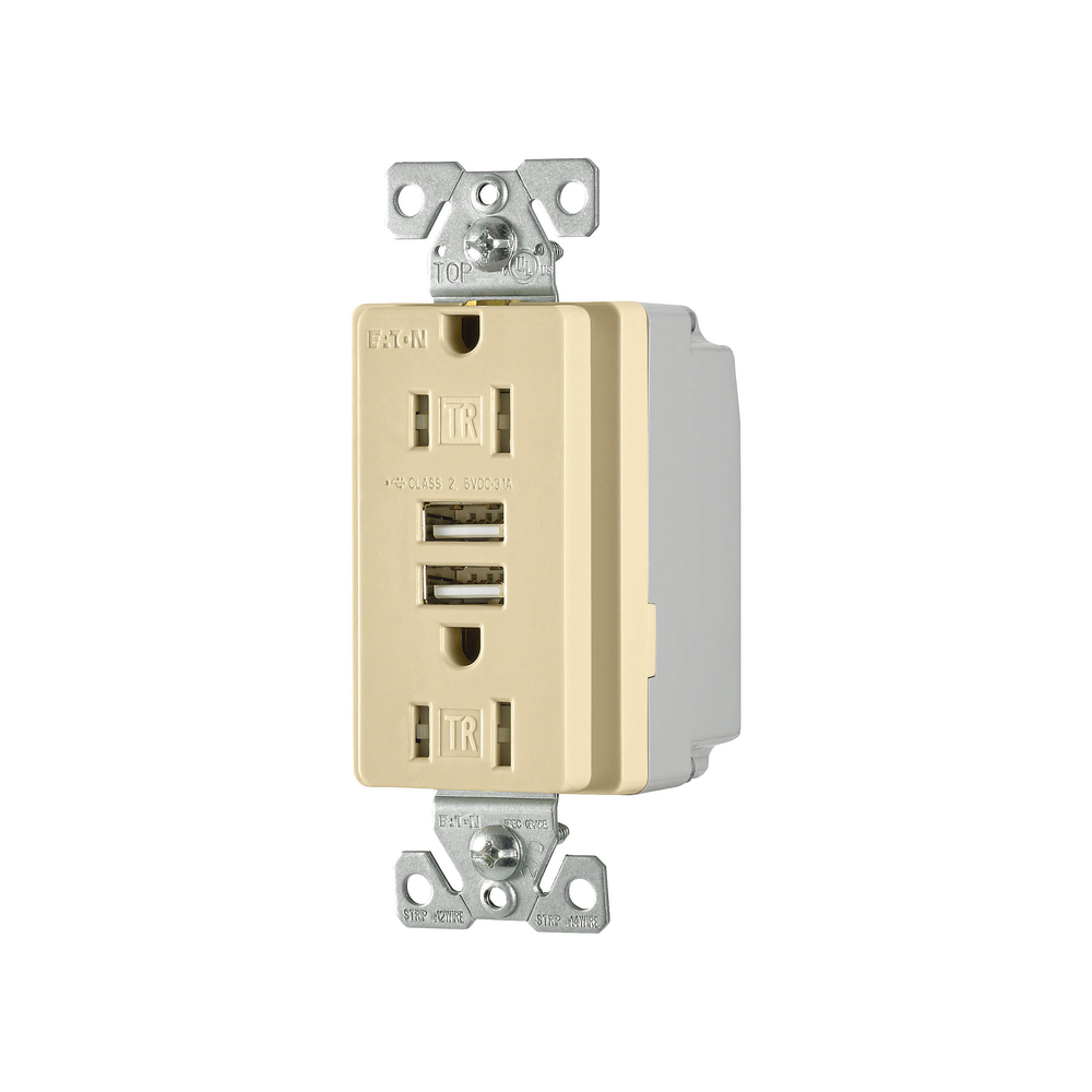 EATON TR7755V-BOX Combination Grounding USB Charger With Tamper-Resistant Duplex Decorator Receptacle, 15 A at 125 VAC, 2 Poles, 3 Wires, Ivory