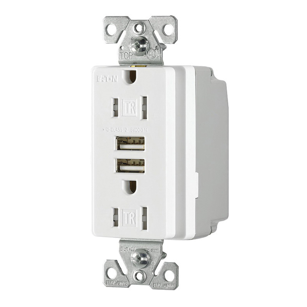 EATON TR7755W-BOX Combination Grounding USB Charger With Tamper-Resistant Duplex Decorator Receptacle, 15 A at 125 VAC, 2 Poles, 3 Wires, White
