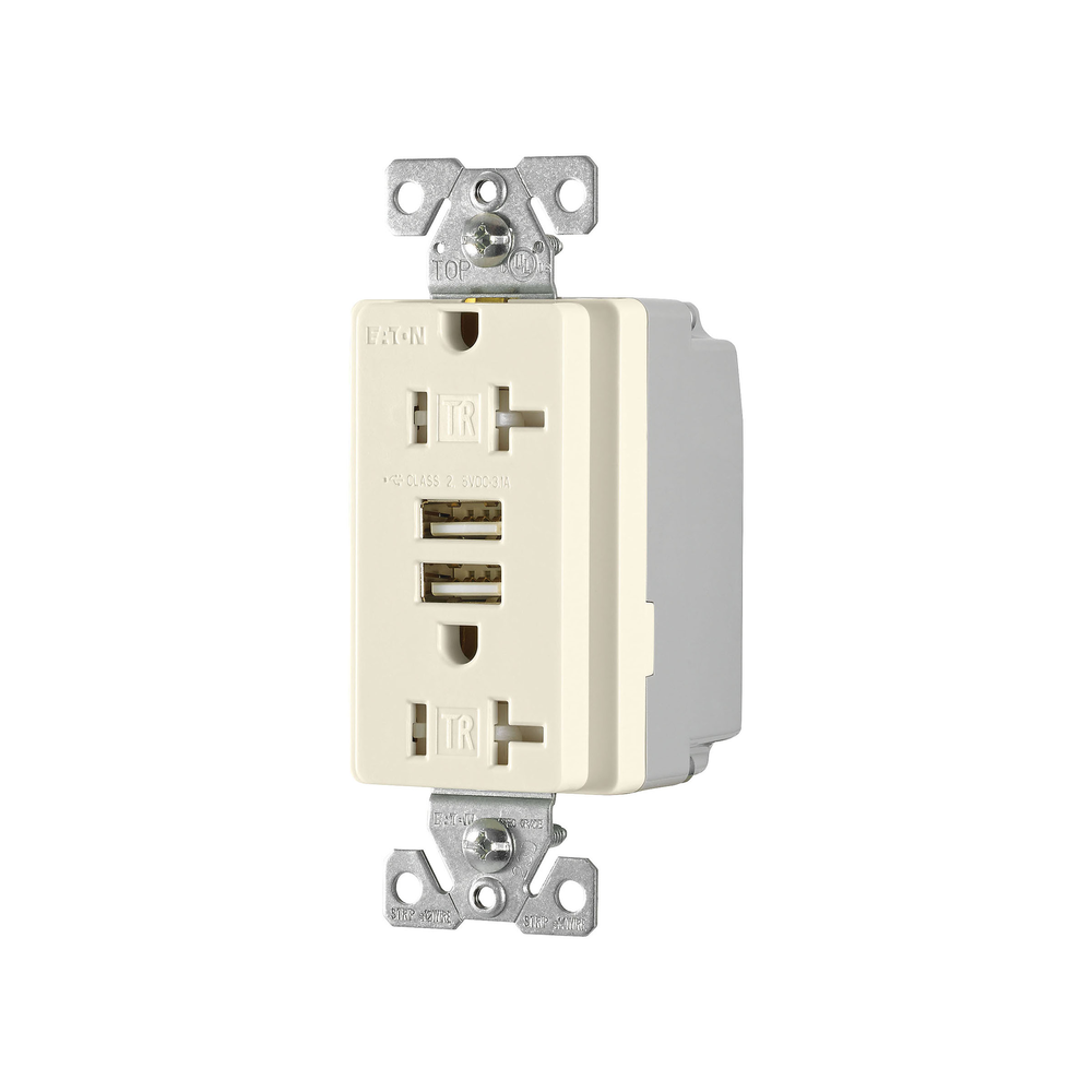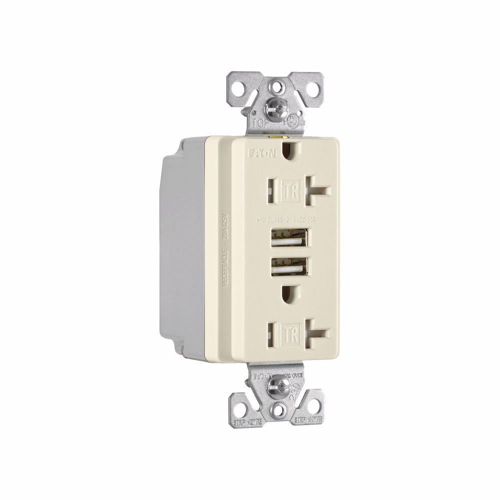 EATON TR7756LA-BOX Combination Grounding USB Charger With Tamper-Resistant Duplex Decorator Receptacle, 15 A at 125 VAC, 2 Poles, 3 Wires, Light Almond
