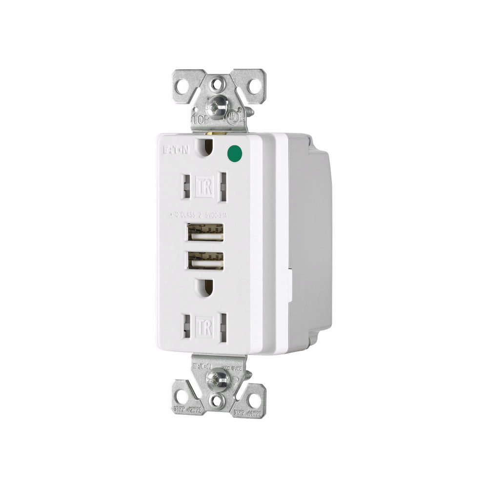 EATON TR8255W TR8355 Combination Grounding USB Charger With Tamper-Resistant Duplex Decorator Receptacle, 15 A at 125 VAC, 2 Poles, 3 Wires, White
