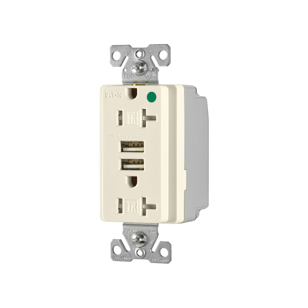 EATON TR8355LA Combination Grounding USB Charger With Tamper-Resistant Duplex Decorator Receptacle, 15 A at 125 VAC, 2 Poles, 3 Wires, Light Almond