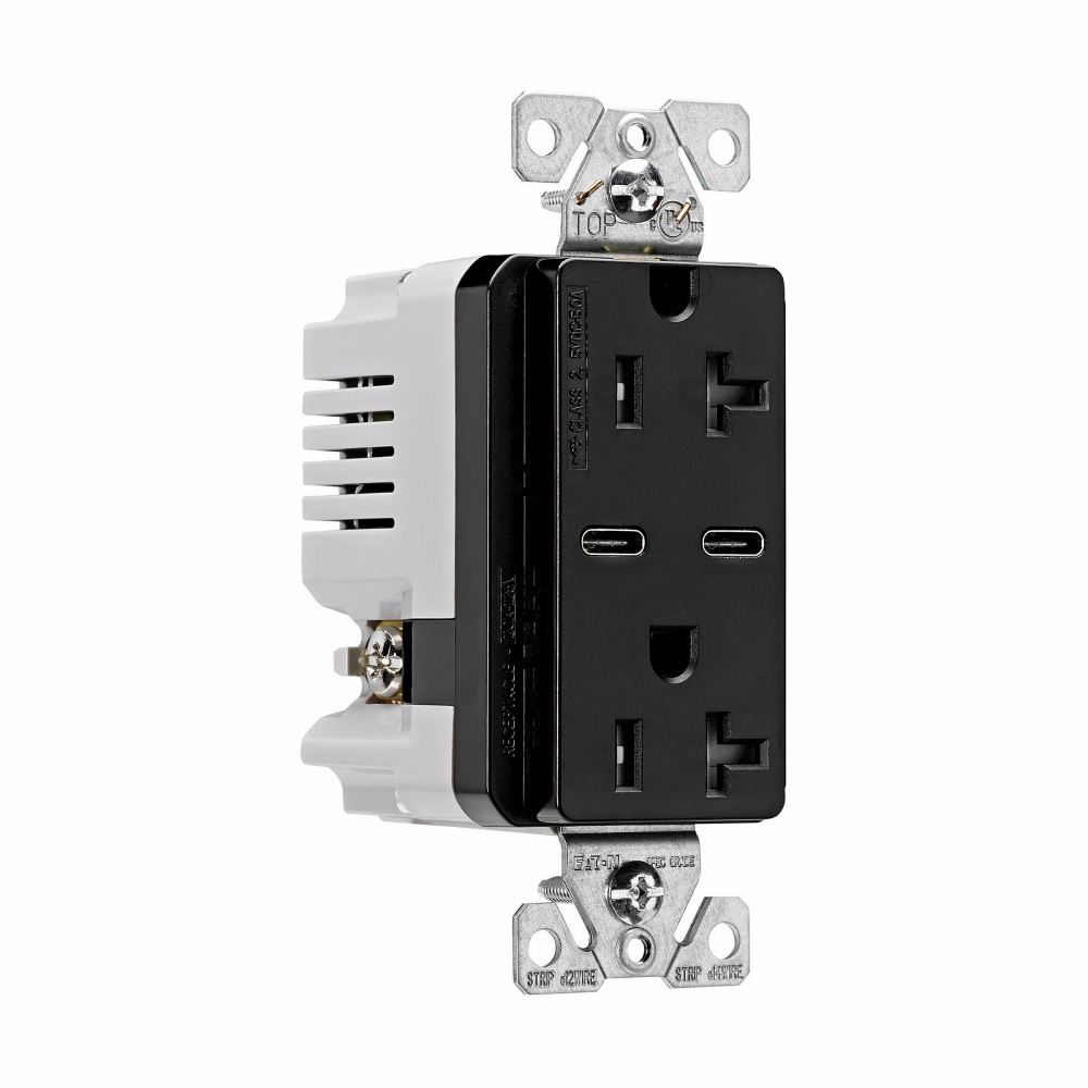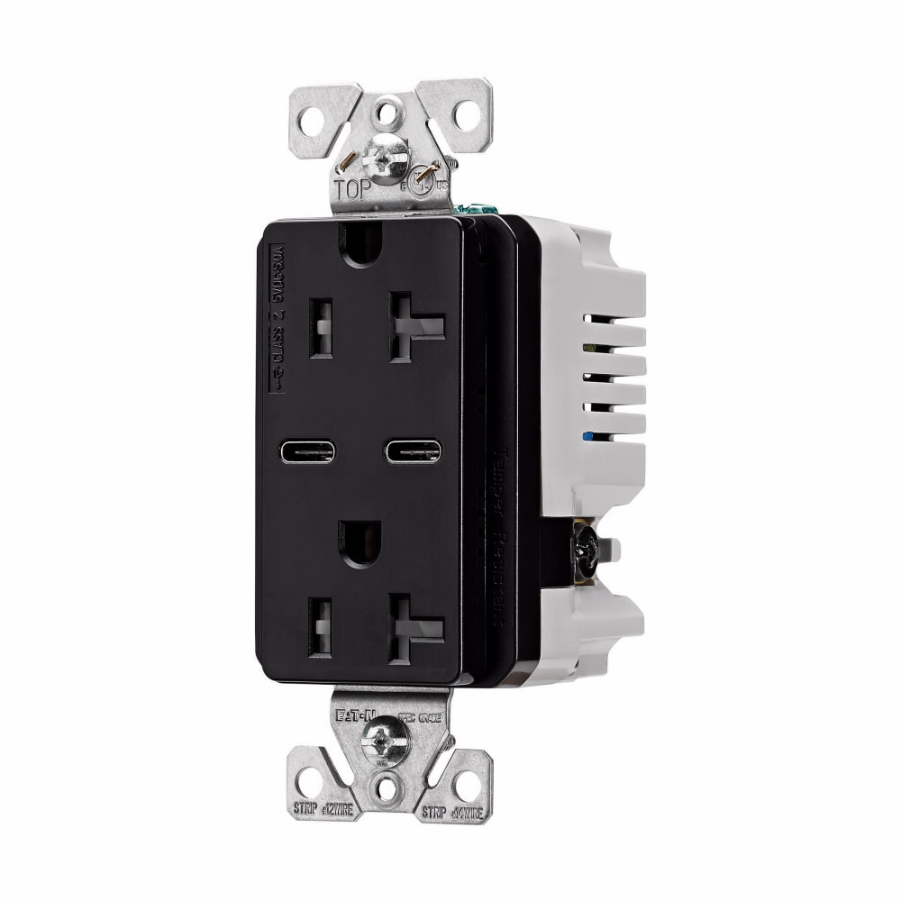 EATON TRUSBC20BK-BOX Decorator High Power Combination USB Charging Device With Duplex Tamper-Resistant Receptacle, 20 A at 125 VAC, 2 Poles, 3 Wires, Black