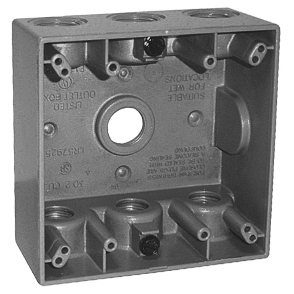 AppletonĀ® WST250 Weatherproof Outlet Box, Die Cast Aluminum, 30.2 cu-in, 2 Gangs, 7 Outlets, 4.52 in H x 4.52 in W x 2.2 in D