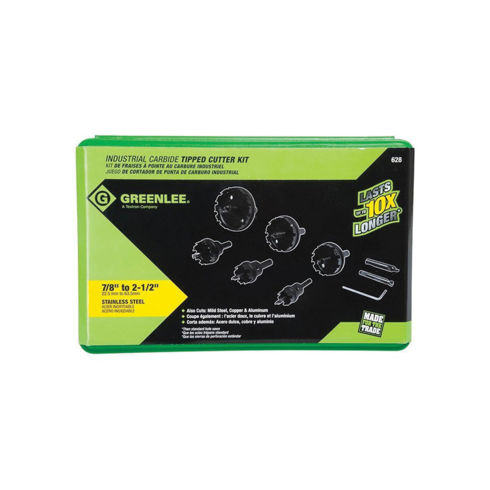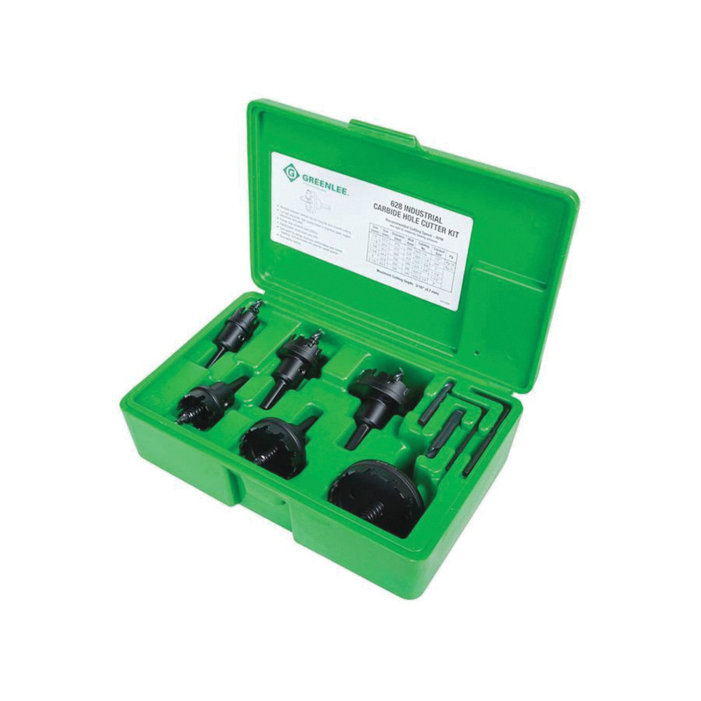 GreenleeĀ® 628 Quick-Change Hole Cutter Kit With Fixed Pockets, 7/8 in Dia Min Cutter, 2-1/2 in Dia Max Cutter, 8 Pieces, For Use With 1/2 to 2 in Conduit, Tungsten Carbide, Oxide Coated