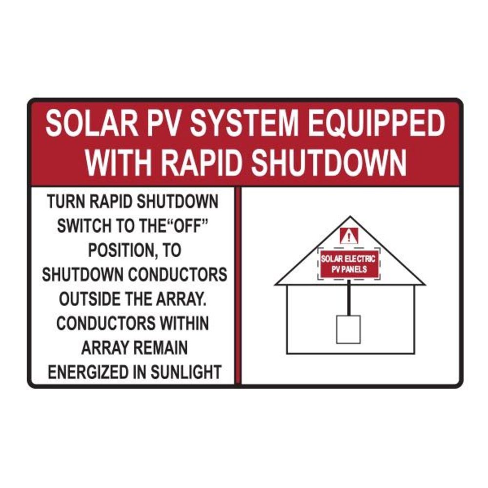 SOLAR PV SYSTEM EQUIPPED WITH RAPID SHUTDOWN TURN RAPID SHUTDOWN SWITCH TO THE "OFF" POSITION TO SHUTDOWN CONDUCTORS OUTSIDE THE ARRAY CONDUCTOR WITHIN ARRAY REMAIN ENERGIZED IN SUNLIGHT