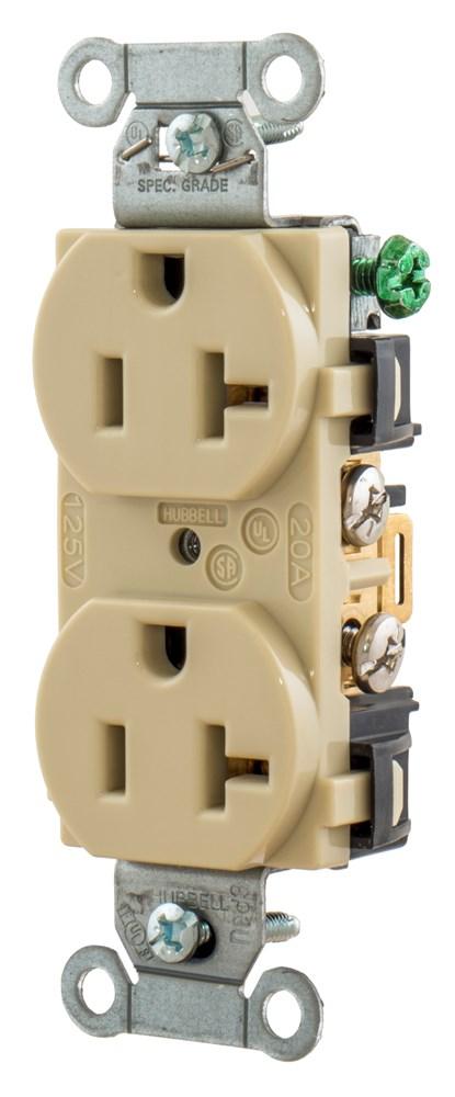 Wiring Device-Kellems BR20I Duplex Self-Grounding Standard Traditional Straight Blade Receptacle, 125 VAC, 20 A, 2 Poles, 3 Wires, Ivory