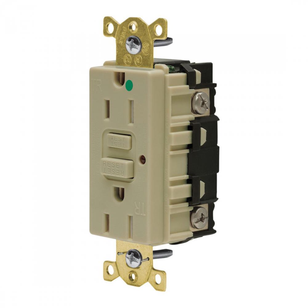 Wiring Device-Kellems Circuit Guard® GFR8200HITR Self-Grounding Staple Tamper/Weather Resistant GFCI Receptacle With LED Indicator, Automatic Grounding Clip, 125 VAC, 15 A, 2 Poles, 3 Wires, Ivory