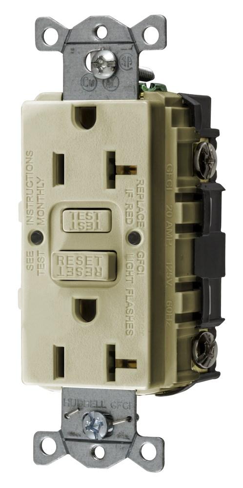 Wiring Device-Kellems GFRST20I 1-Phase Decorator Duplex Self-Test GFCI Receptacle, 125 VAC, 20 A, 2 Poles, 3 Wires, Ivory