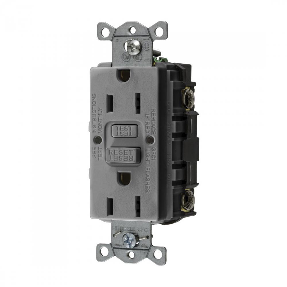 Wiring Device-Kellems GFRST52MGY Duplex Standard Self-Test Straight Blade GFCI Receptacle With Power Denial, 125 VAC, 15 A, 2 Poles, 3 Wires, Gray