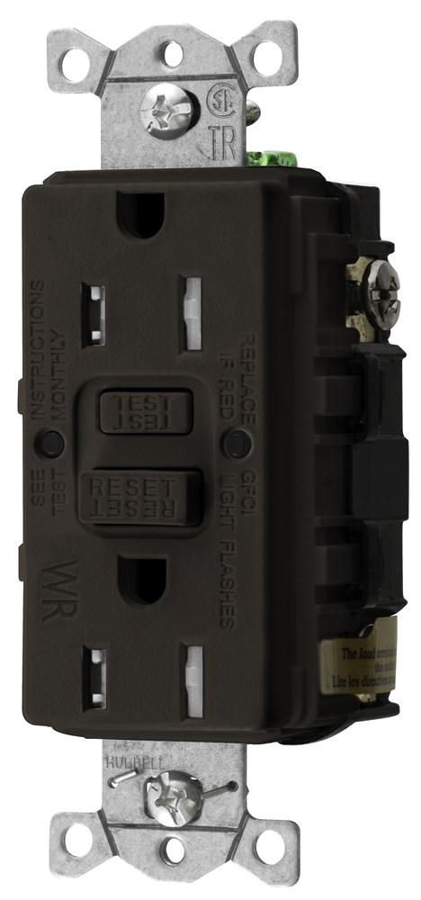 Wiring Device-Kellems GFTWRST15 1-Phase Decorator Duplex Standard Self-Test GFCI Receptacle, 125 VAC, 15 A, 2 Poles, 3 Wires, Brown