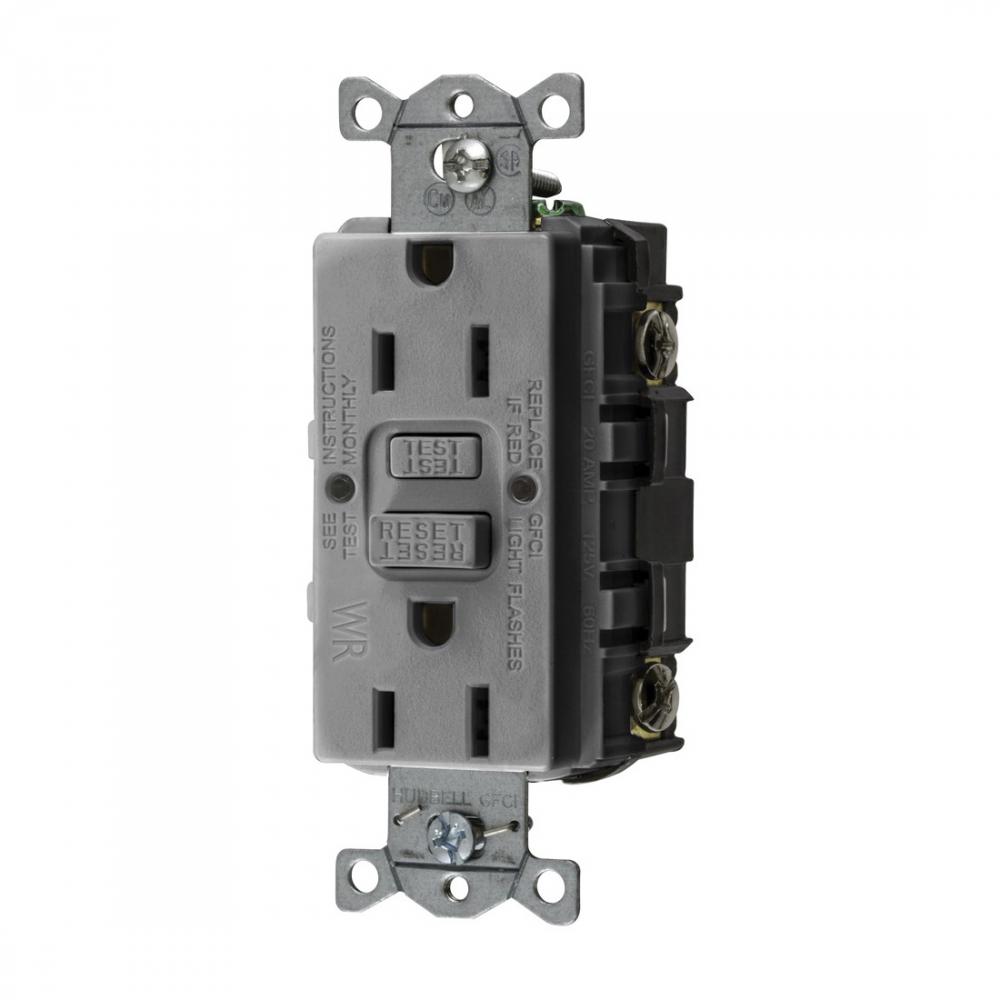 Wiring Device-Kellems AUTOGUARD® Style Line GFWRST15GY Decorator Duplex Heavy Duty Standard Self-Test Weather Resistant GFCI Receptacle, 125 VAC, 15 A, 2 Poles, 3 Wires, Gray
