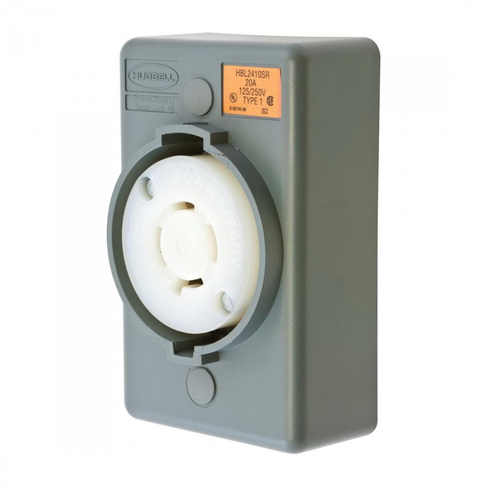 Hubbell® Twist-Lock® Safety-Shroud® HBL2410SR Shrouded Single Straight Locking Receptacle, 125/250 VAC, 20 A, 3 Poles, 4 Wires, Gray