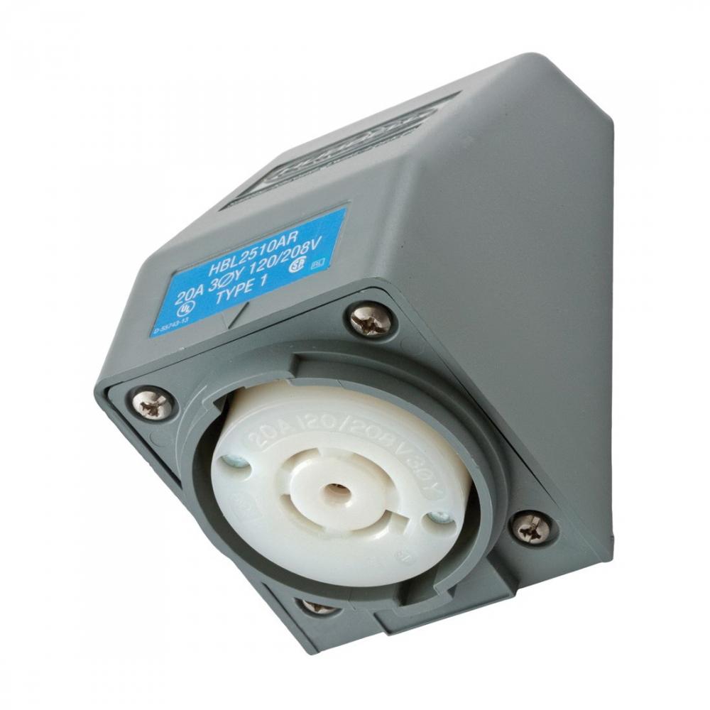 Hubbell® Twist-Lock® Safety-Shroud® HBL2510AR Angled Shrouded Single Locking Receptacle, 120/208 VAC, 20 A, 4 Poles, 5 Wires, Gray