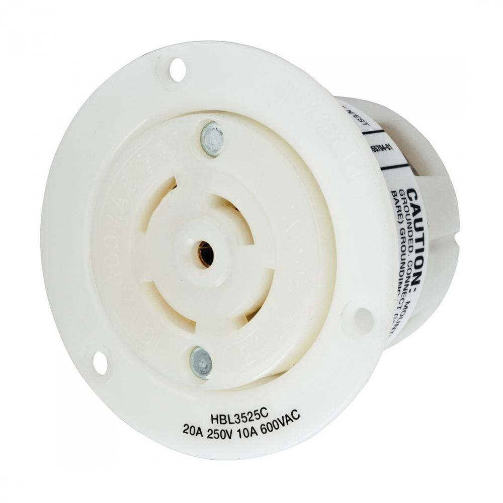 Wiring Device-Kellems Twist-Lock® Insulgrip® HBL3525C Flanged Grounding Single Standard Locking Receptacle, 600 VAC/250 VDC, 10/20 A, 4 Poles, 5 Wires, White