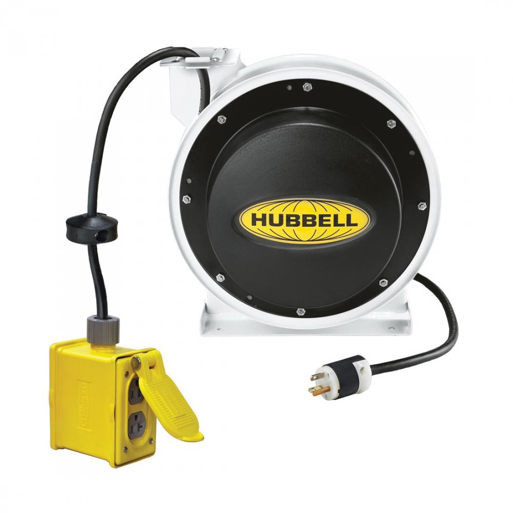 Wiring Device-Kellems HBL45123R20W Heavy Duty Industrial Power Cord Reel With Portable Outlet Box, (1) 5252GRY Duplex Receptacle, 125 VAC, 20 A, 45 ft L Cord, 12 AWG Conductor, 1 Outlet