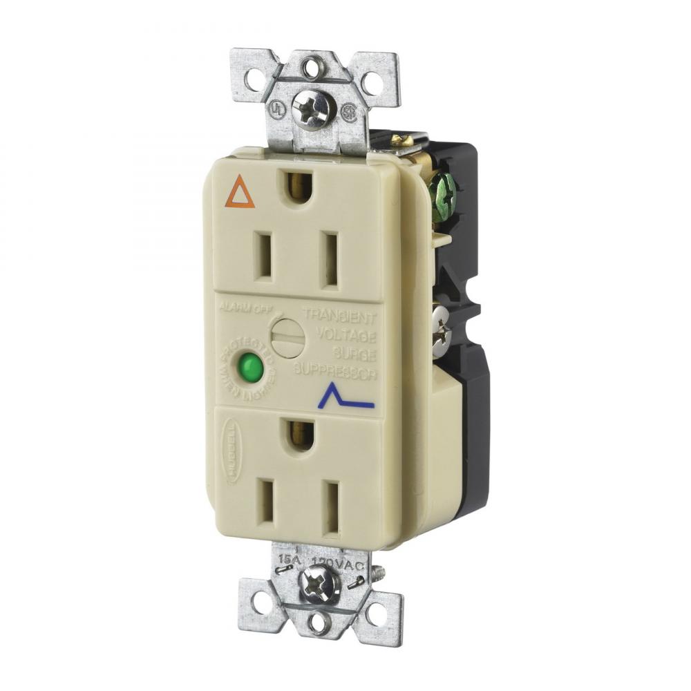 Wiring Device-Kellems SpikeShield® IG5262ISA Isolated Ground Standard Duplex Receptacle With Light, Alarm, 15 A at 125 VAC, 60 Hz