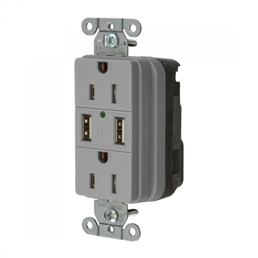 Wiring Device-Kellems SNAPConnect® StyleLine® SNAP15USBGY Decorator Duplex Extra Heavy Duty Grounding Tamper Resistant USB Charger Receptacle With Green LED, 15 A, 125 VDC, 0.5 hp, 1 Phase, 2 Poles, 3 Wires, Gray