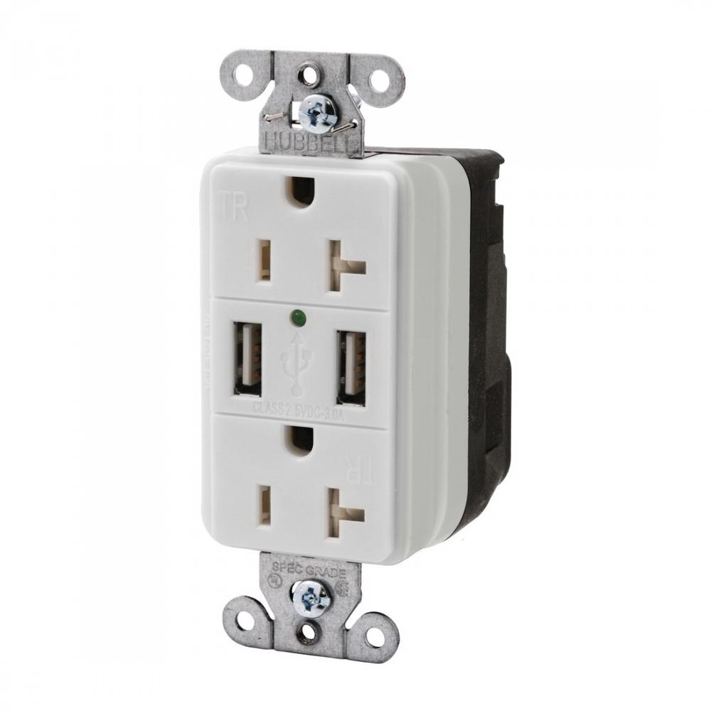 Wiring Device-Kellems SNAPConnect® StyleLine® SNAP20USBW Decorator Duplex Extra Heavy Duty Grounding Tamper Resistant Standard USB Charger Receptacle With Green LED, 20 A, 125 VDC, 1 hp, 375 W, 1 Phase, 2 Poles, 3 Wires, White