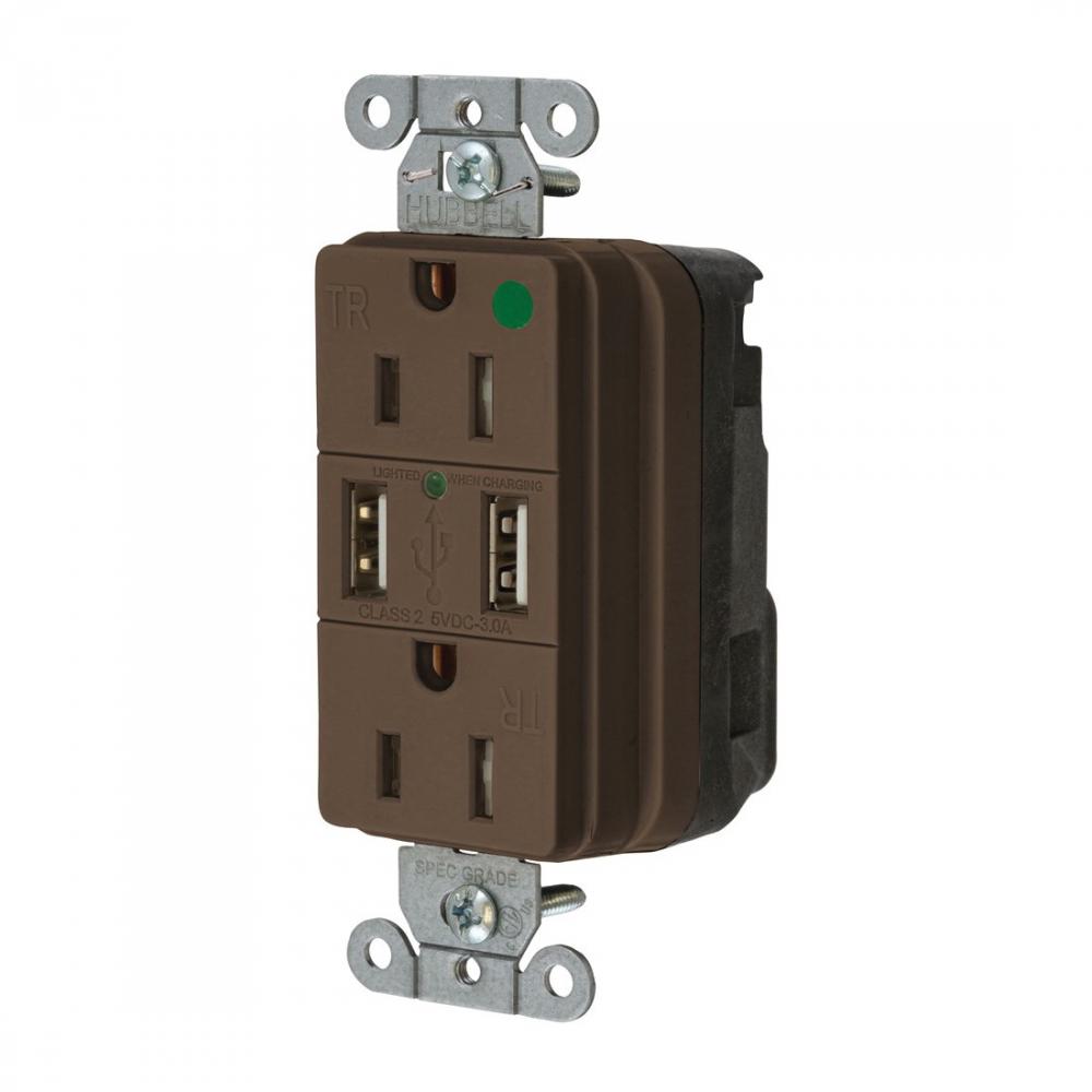 Wiring Device-Kellems SNAPConnect® StyleLine® SNAP8200USB Decorator Duplex Extra Heavy Duty Grounding Tamper Resistant USB Charger Receptacle With Green LED, 15 A, 125 VDC, 0.5 hp, 1 Phase, 2 Poles, 3 Wires, Brown