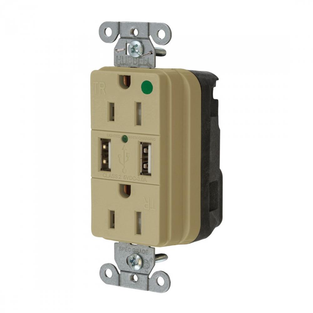 Wiring Device-Kellems SNAPConnect® StyleLine® SNAP8200USBI Decorator Duplex Extra Heavy Duty Grounding Tamper Resistant USB Charger Receptacle With Green LED, 15 A, 125 VDC, 0.5 hp, 1 Phase, 2 Poles, 3 Wires, Ivory