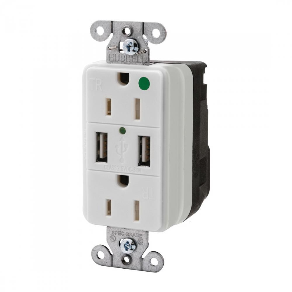 Wiring Device-Kellems SNAPConnect® StyleLine® SNAP8200USBW Decorator Duplex Extra Heavy Duty Grounding Tamper Resistant USB Charger Receptacle With Green LED, 15 A, 125 VDC, 0.5 hp, 1 Phase, 2 Poles, 3 Wires, White