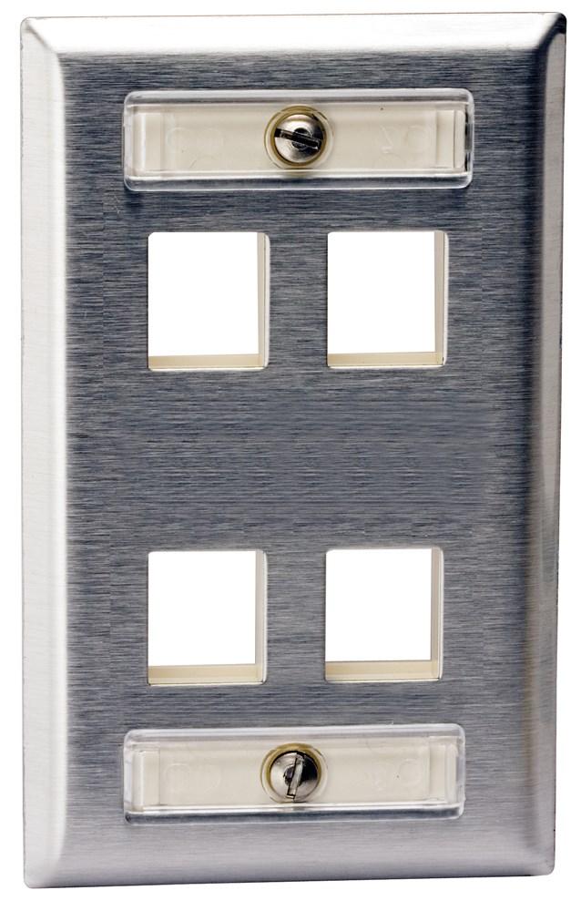 Wiring Device-Kellems iSTATION™ SSFL14 Rear Load Standard Stamped Keystone Faceplate With Label Field, 1 Gang, 4 Ports, Audio/Video/Data/Fiber Module, Threaded Mount, 430 Stainless Steel
