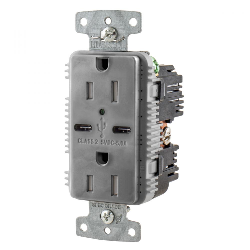 Wiring Device-Kellems tradeSELECT® USB15C5GY Duplex Grounding Heavy Duty Tamper Resistant Standard USB Charger Receptacle With Green LED, 15 A, 125 VDC, 1 Phase, 2 Poles, 3 Wires, Gray