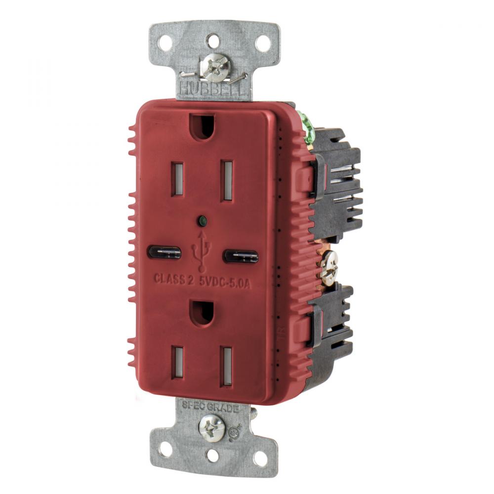Wiring Device-Kellems tradeSELECT® USB15C5R Duplex Grounding Heavy Duty Tamper Resistant USB Charger Receptacle With Green LED, 15 A, 125 VDC, 1 Phase, 2 Poles, 3 Wires, Red