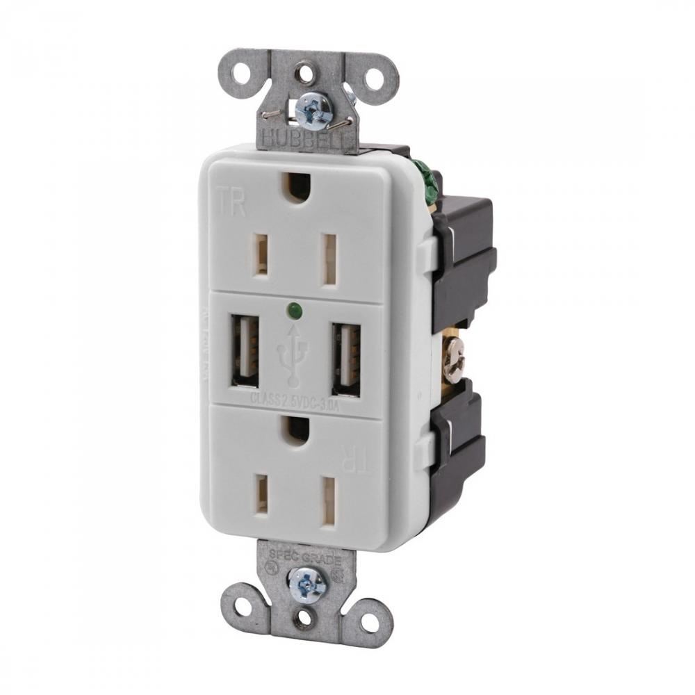 Wiring Device-Kellems USB15X2OW Decorator Duplex Self-Grounding Tamper Resistant Standard USB Charger Receptacle With Green LED, 15 A, 125 VAC, 1875 W, 1 Phase, 2 Poles, 3 Wires, Off-White