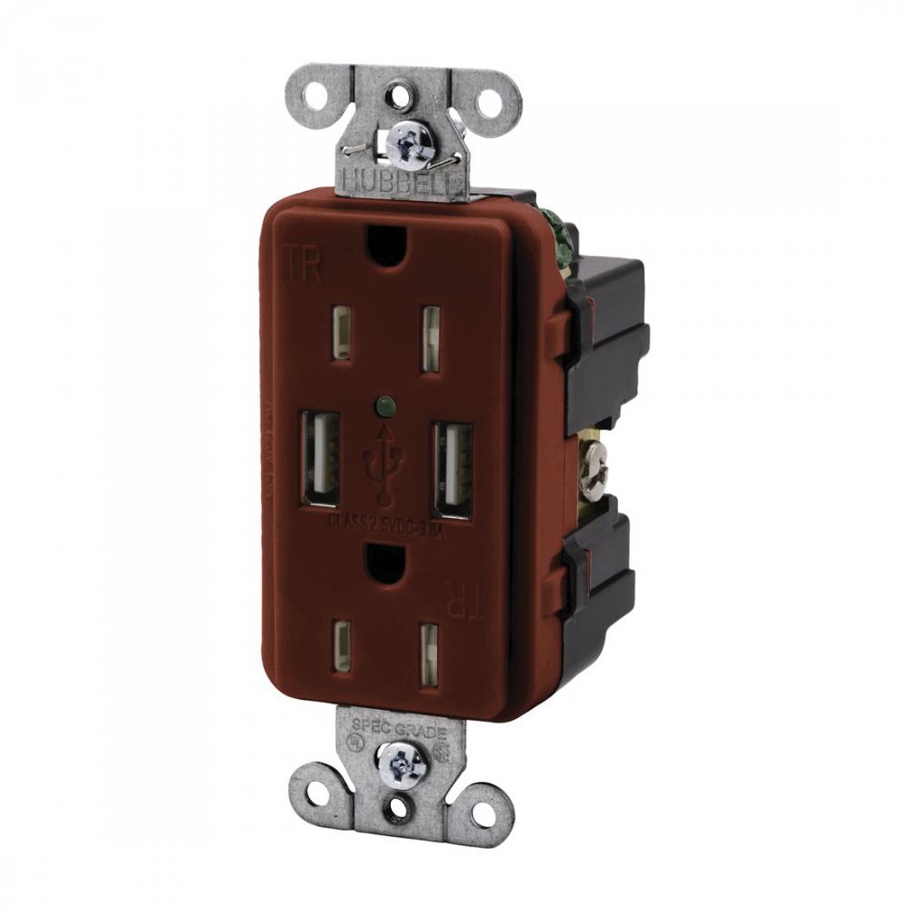 Wiring Device-Kellems USB15X2R Decorator Duplex Self-Grounding Tamper Resistant Standard USB Charger Receptacle With Green LED, 15 A, 125 VAC, 1875 W, 1 Phase, 2 Poles, 3 Wires, Red