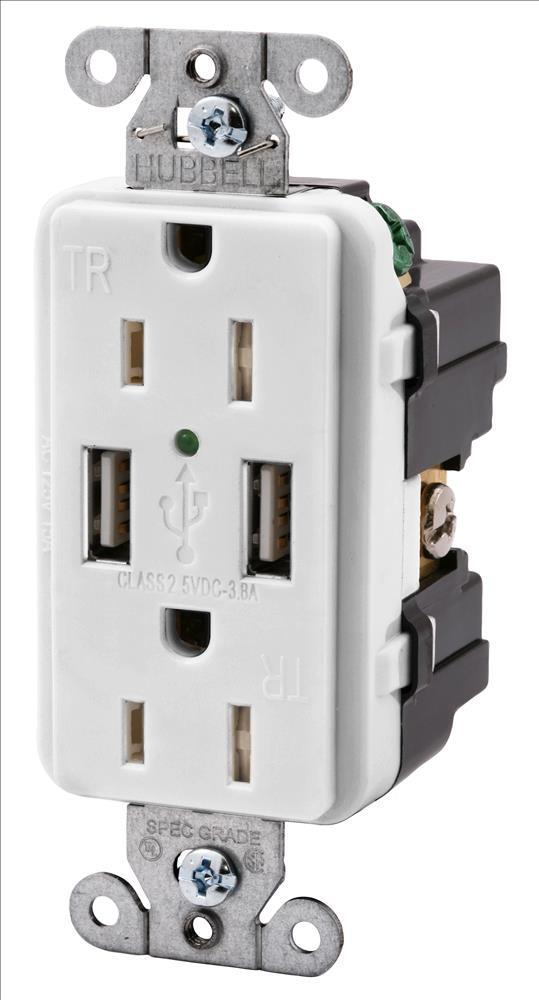 Wiring Device-Kellems USB15X2W Decorator Duplex Straight Blade Tamper-Resistant Receptacle and USB Charger, 125 VAC, 15 A, 1/2 hp, 1 Phase, 2 Poles, 3 Wires, White